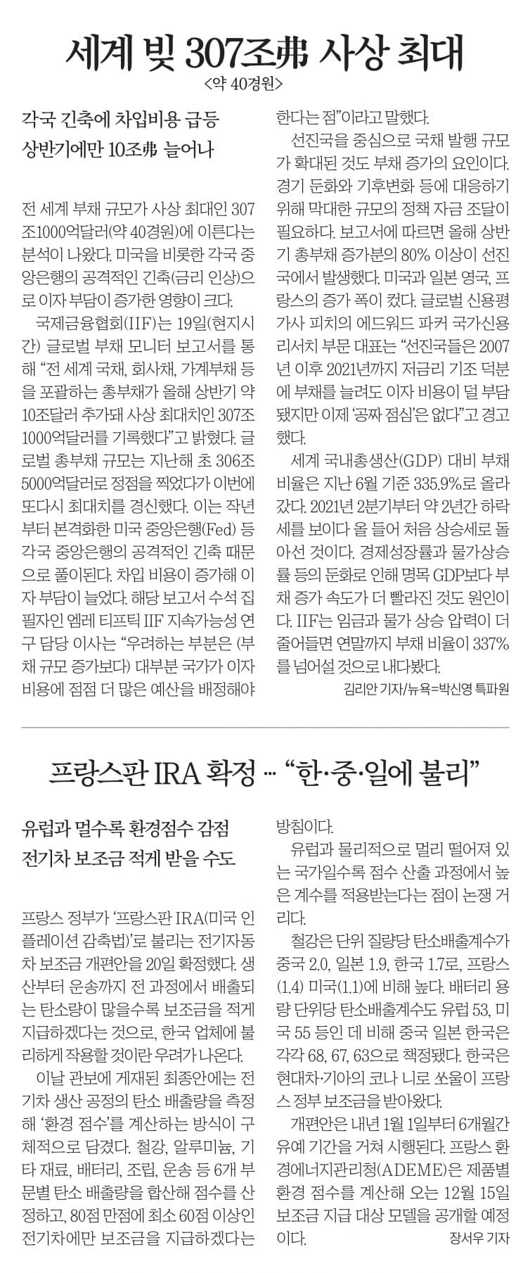 ☞글로벌 부채 307조달러 ... 금리인상에 사상 최대치...총 부채비율은 336% ... 6개월새 2%포인트 상승 ...금리 상승에 차입비용 급증 ... 80%가 선진국에서