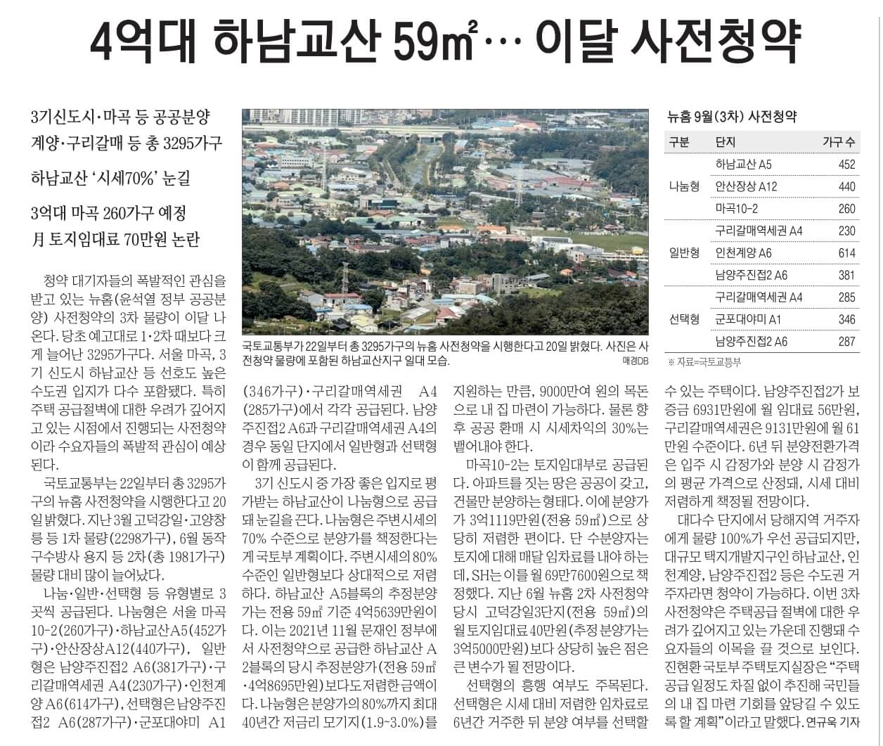 ☞4억대 하남교산 공급된다 ... 뉴홈 3차 사전청약...1, 2차보다 증가물량 수도권만 인천계양, 구리갈매역세권 등...3기신도시 최고인기 하남교산 시세70% 나눔형 공급 눈길...마곡 토지임대료 월 70만원 논란