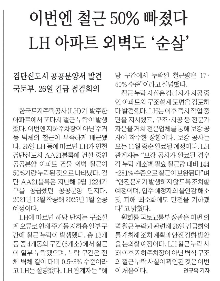 ☞ 이번엔 철근 50% 빠졌다 LH 아파트 외벽도 '순살'