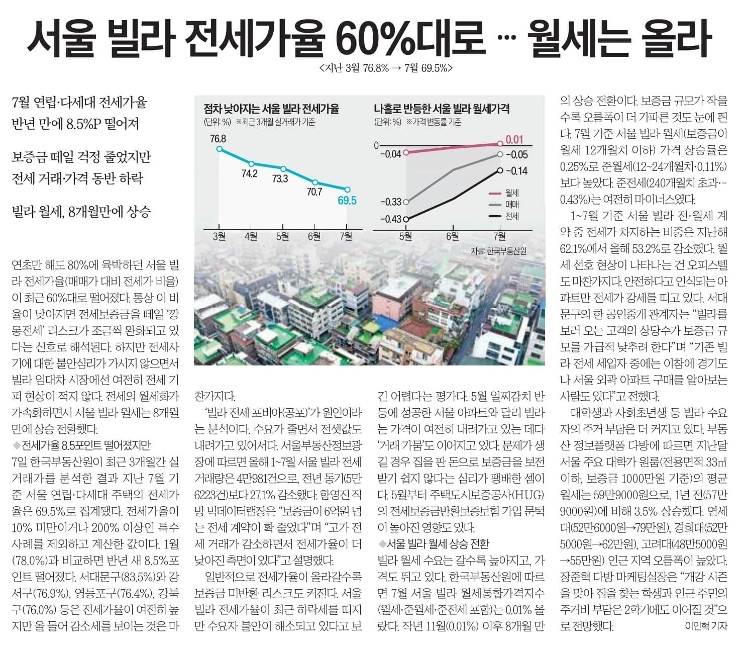 연초만 해도 80%에 육박하던 서울 빌라 전세가율(매매가 대비 전세가 비율)이 최근 60%대로 떨어졌다. 통상 이 비율이 낮아지면 전세보증금을 떼일 깡통전세 리스크가 조금씩 완화되고 있다는 신호로 해석된다.