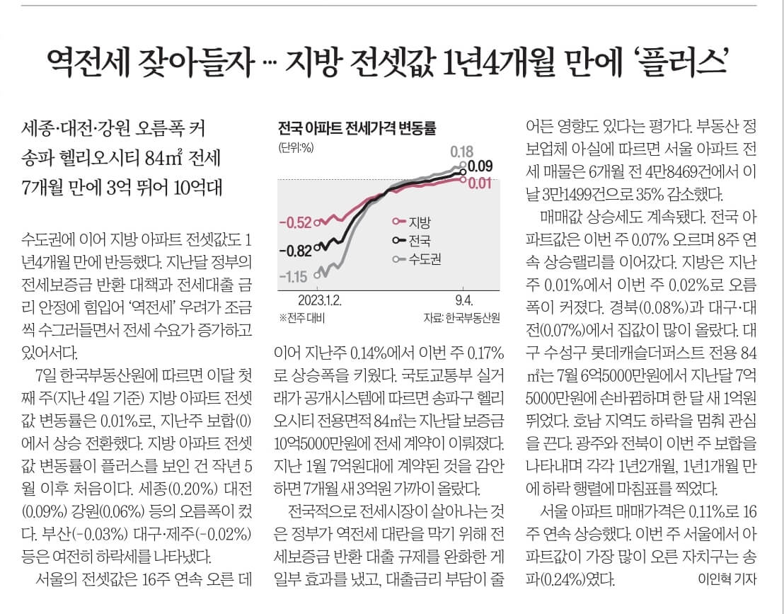 전국의 주간 매매 및 전세 가격이 동반 상승한 가운데 전셋값 상승 폭이 확대됐다. '역전세' 우려가 점점 해소되는 분위기다. 전국 전세가격은 7주 연속 상승세를 기록 중이며, 상승 폭도 매주 꾸준히 커지고 있다.
